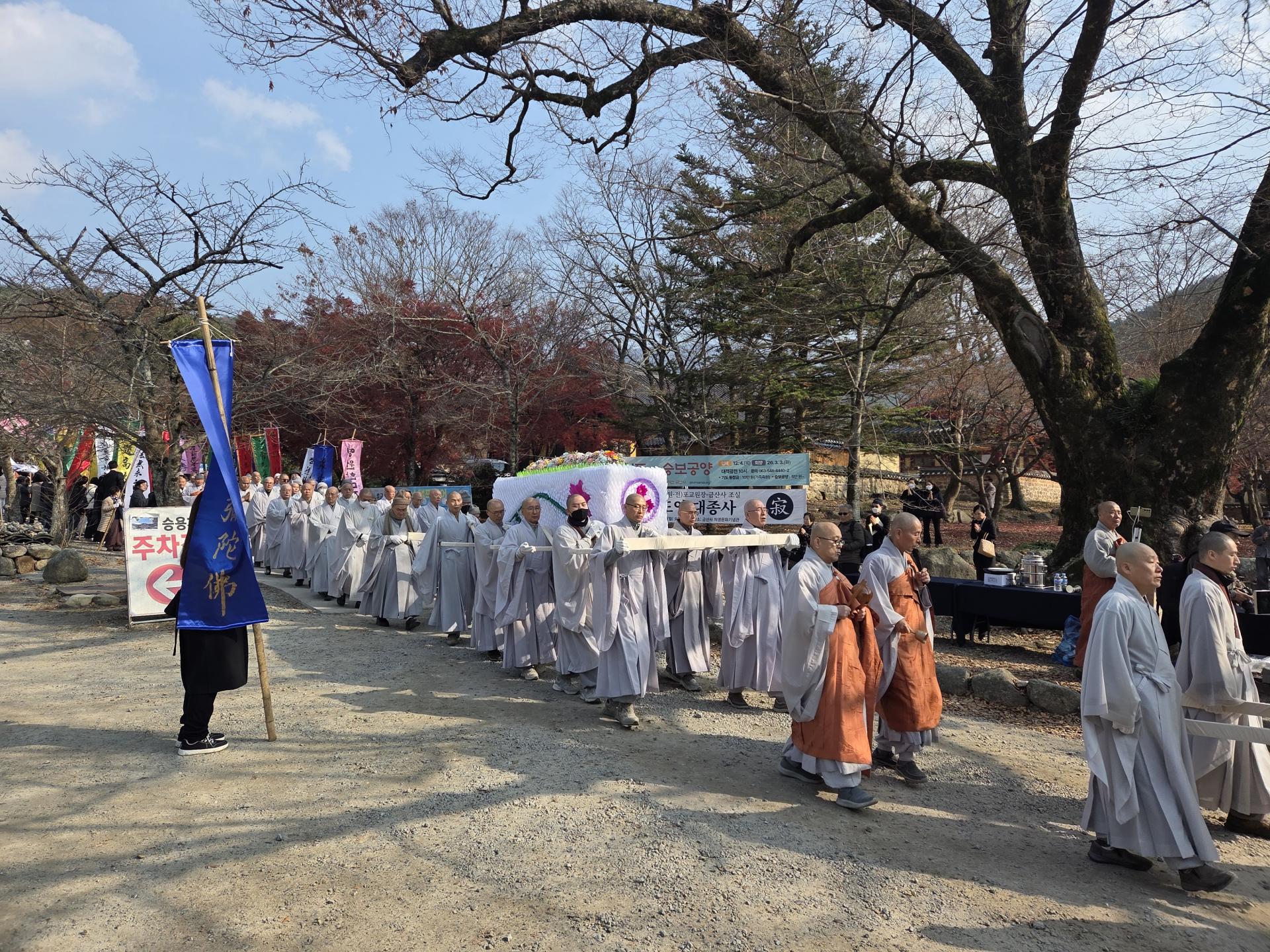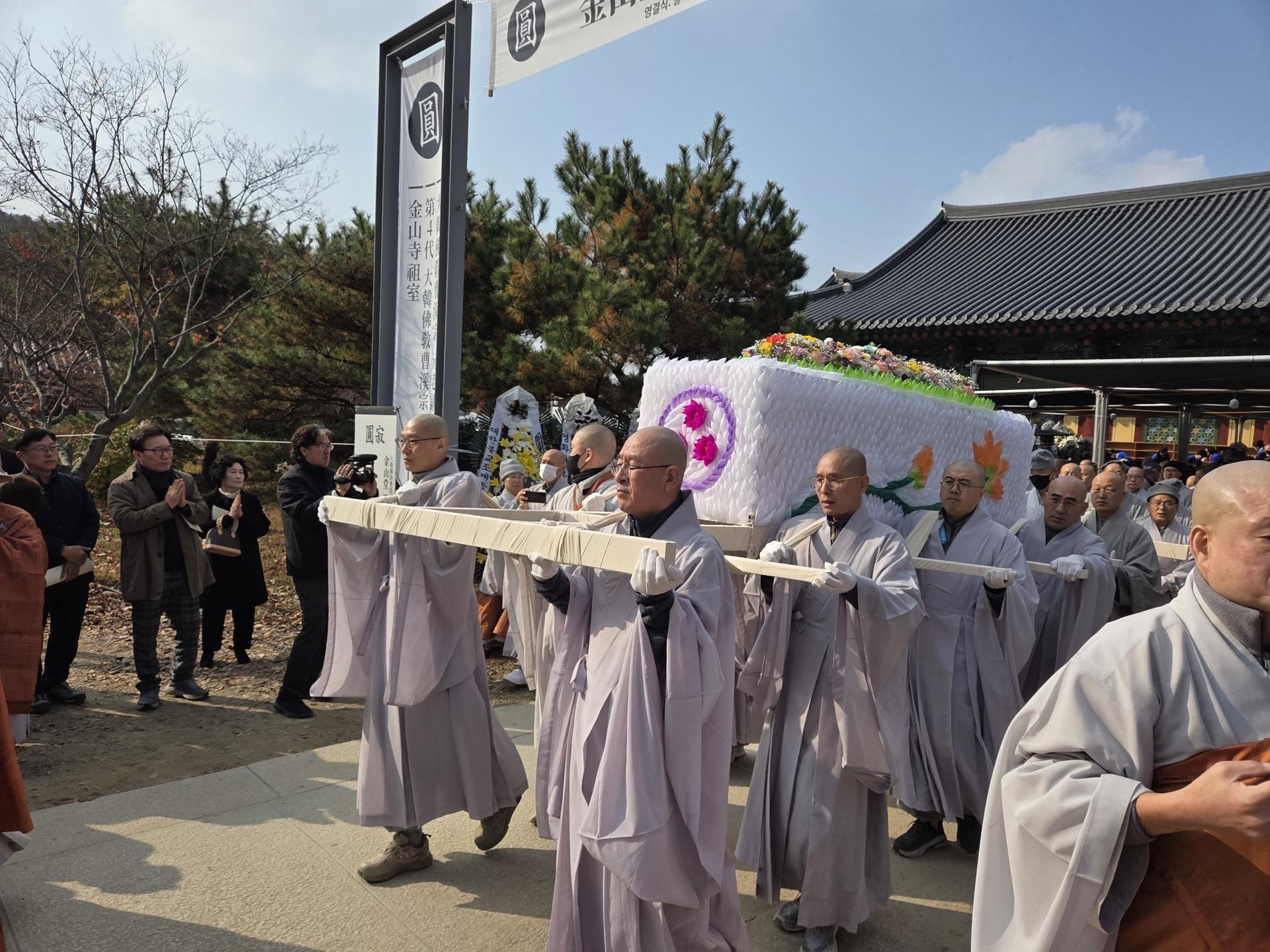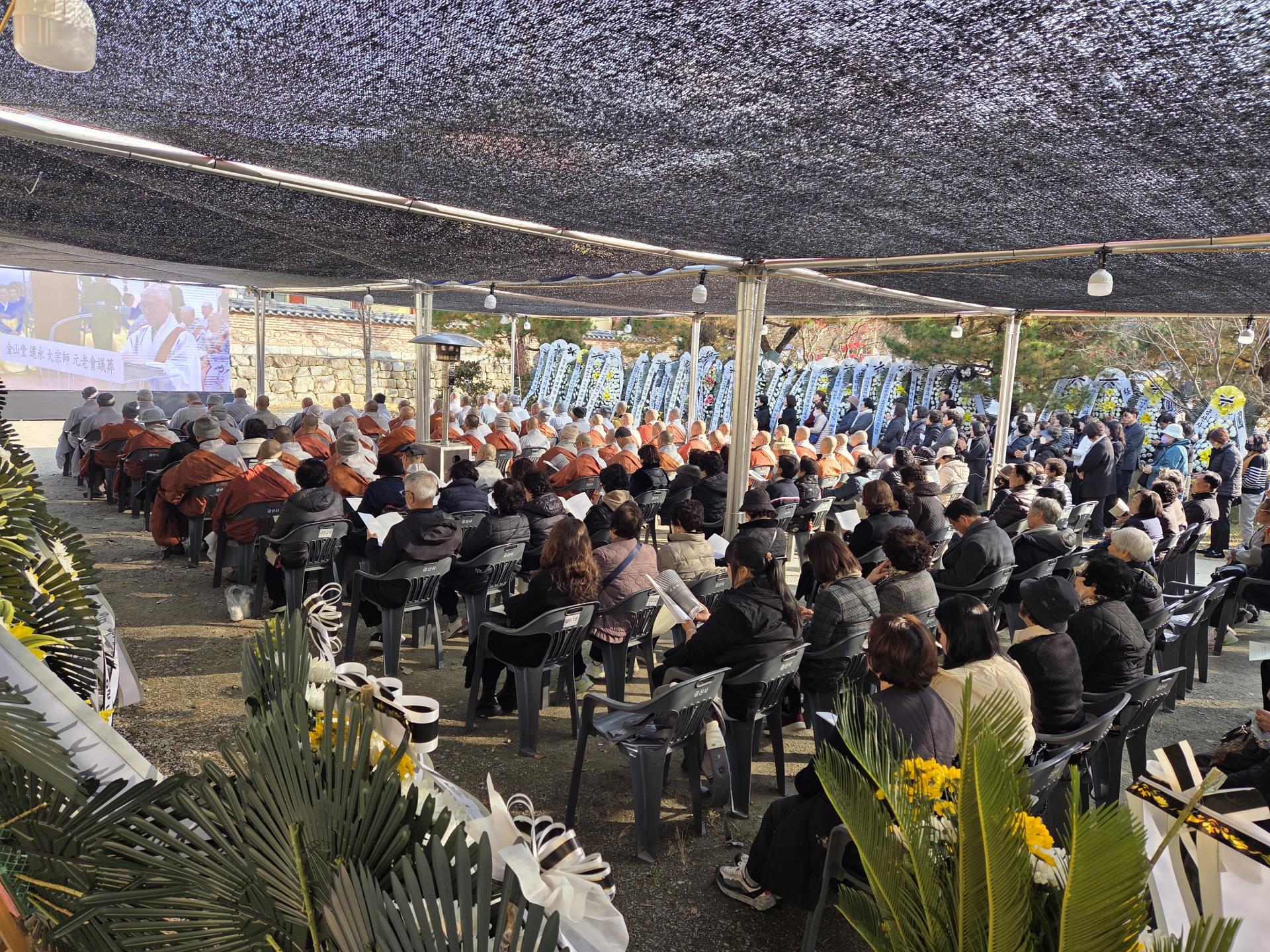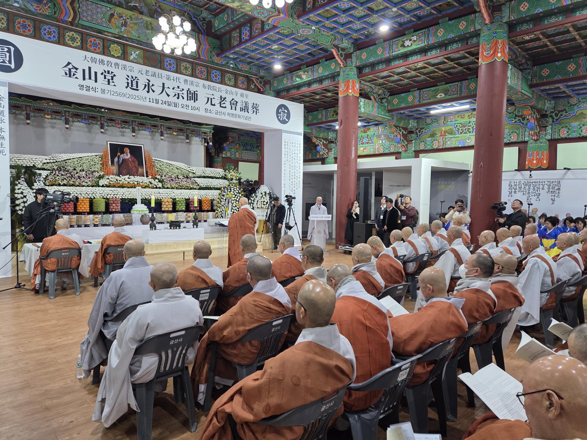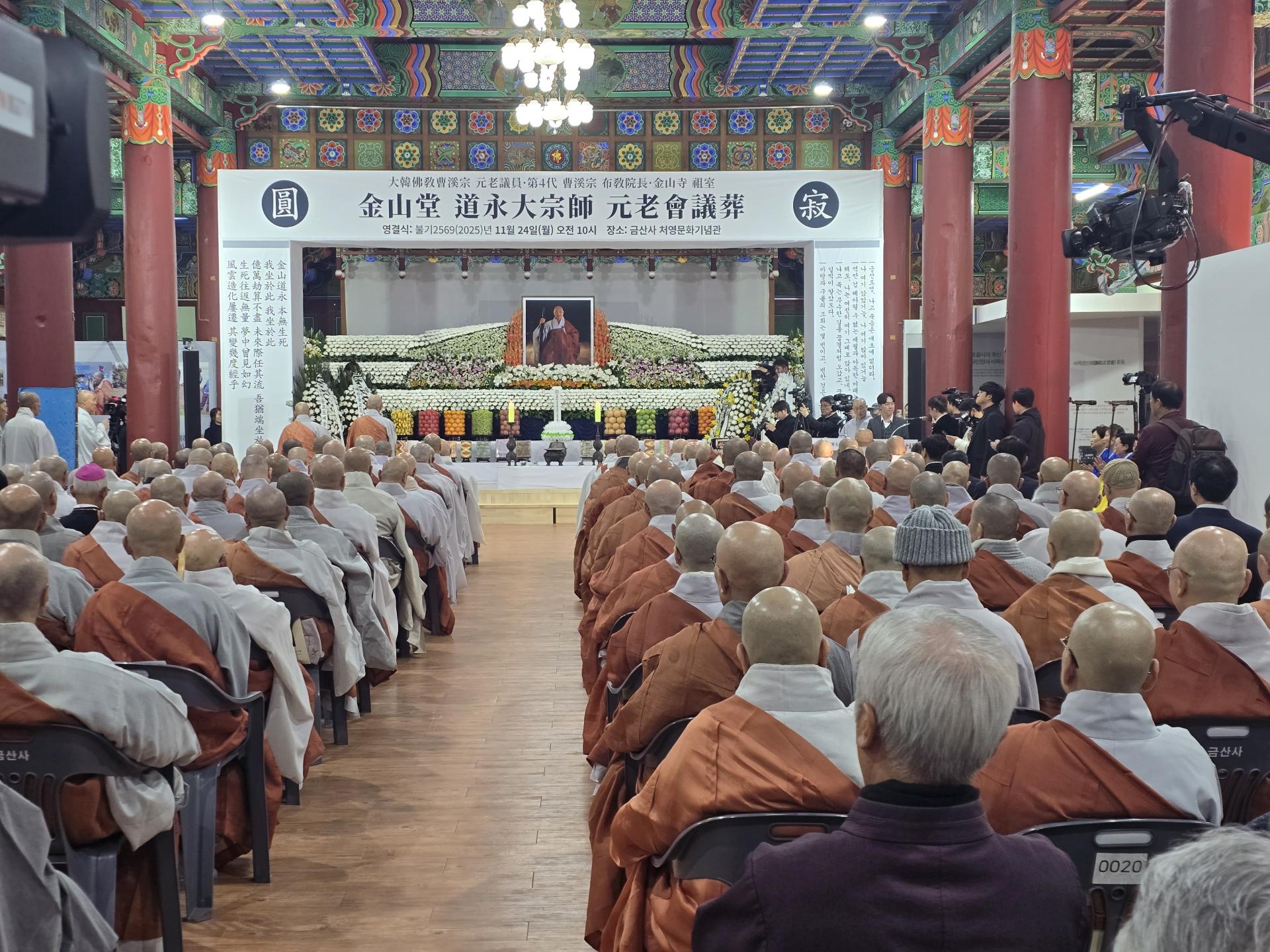 조계종 원로의원이자 금산사 조실인 금산당 도영대종사의 영결식이 11월 24일 금산사 처영기념관에서 원로회의장으로 엄수됐습니다. 종정 성파 스님의 증명으로 봉행된 이날 영결식에는 원로의장 자광, 총무원장 진우, 원로의원 보선·도후·철웅·허허·성오·원각·정여·법등·동명, 문도 도원·향봉·도법·평상·원행, 중앙종회의장 주경, 호계원장 정묵, 전 총무원장 설정 스님을 비롯한 전국 교구본사 주지스님 및 중앙종회의원 스님들과 금산당 도영대종사 유가족, 이재형 법보신문 대표, 한광수 금산사신도회장, 유남희 송광사신도회장, 김관영 전북도지사, 문승우 전북도의회의장, 정성주 김제시장, 우범기 전주시장, 박경도 국립전주박물관장 등 사부대중 1000여 명이 동참했습니다.