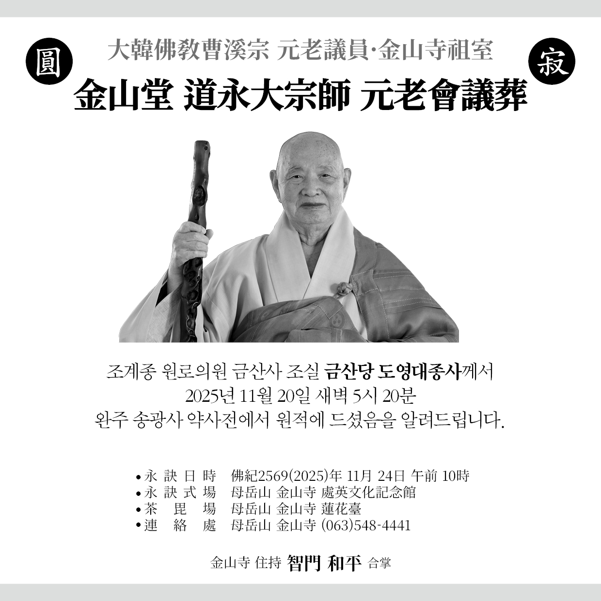 금산당 도영 대종사 영결식안내 [11.24.(월) 10시 금산사 처영문화기념관]